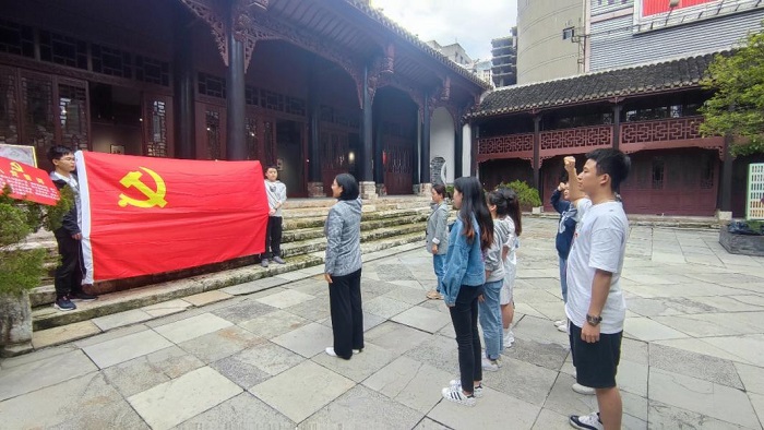 到达达德公司旧址后,举行了新党员宣誓仪式。在潘吉的领誓下,全体党员面对鲜红的党旗,紧握右拳,以饱满的精神状态、洪亮的声音庄严宣誓,表明了自己为党和国家奋斗终身的坚定决心,表达了自己对中国共产党忠贞不渝的革命热情。