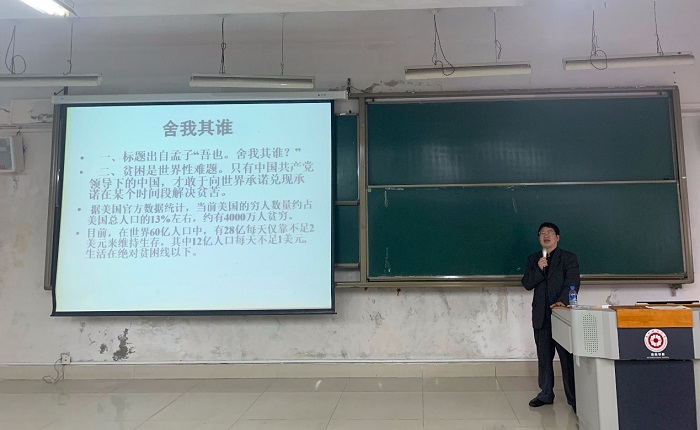 游来林通过案例讲解,向同学们讲述了我国脱贫攻坚取得的历史性的成就。他指出,扶贫是古今中外治国理政的一件大事,中国脱贫攻坚的伟大胜利,增强了中国人民的“四个自信”。