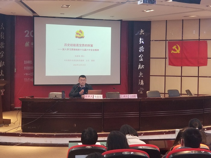 朱新现指出,十九届六中全会《决议》是新时代中国共产党人牢记初心使命、坚持和发展中国特色社会主义的政治宣言,是以史为鉴、开创未来,实现中华民族伟大复兴的行动指南。朱新现从重要历史关头与党的三个“历史决议”、全面把握十九届六中全会的精髓要义、永恒赶考路与再起新征程三个部分进行重点讲解。朱新现介绍了党的三个“历史决议”的时间、时代形势、主要内容及其对党发展的重大意义,并引用《中共中央关于党的百年奋斗重大成就和历史经验的决议》详细讲解了十九届六中全会精神的精髓要义。