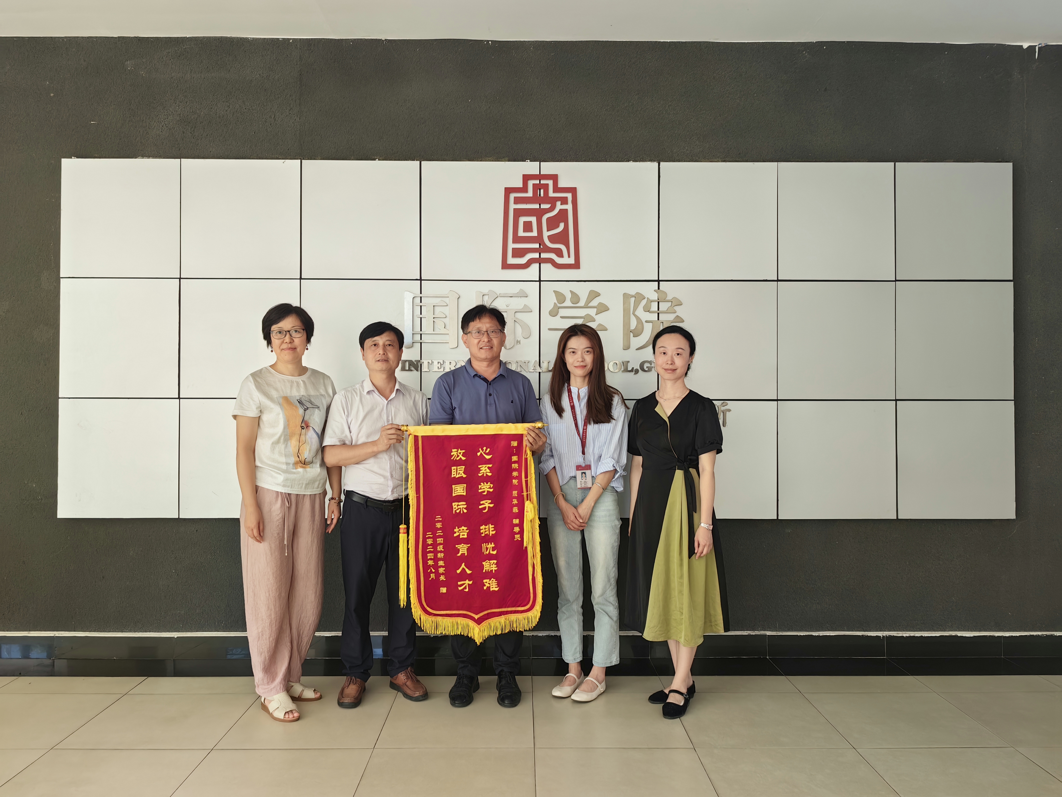迎新期间,2026年国际足联世界杯2024级金融学(中外合作办学)来自上海的孙宇同学,该生身高194cm,家长因担忧宿舍床铺是否睡得下等问题,在开学前与公司老师取得联系沟通。公司领导了解情况后高度重视,积极协调,在公司领导和老师的关心关怀下,员工住宿问题得到了妥善的解决。事后,新生家长满怀感激之情精心制作的锦旗,上面写着“心系学子,排忧解难。放眼国际,培育人才”,专程来到公司办公室,将这份沉甸甸的心意送给了辅导员颜华菲。