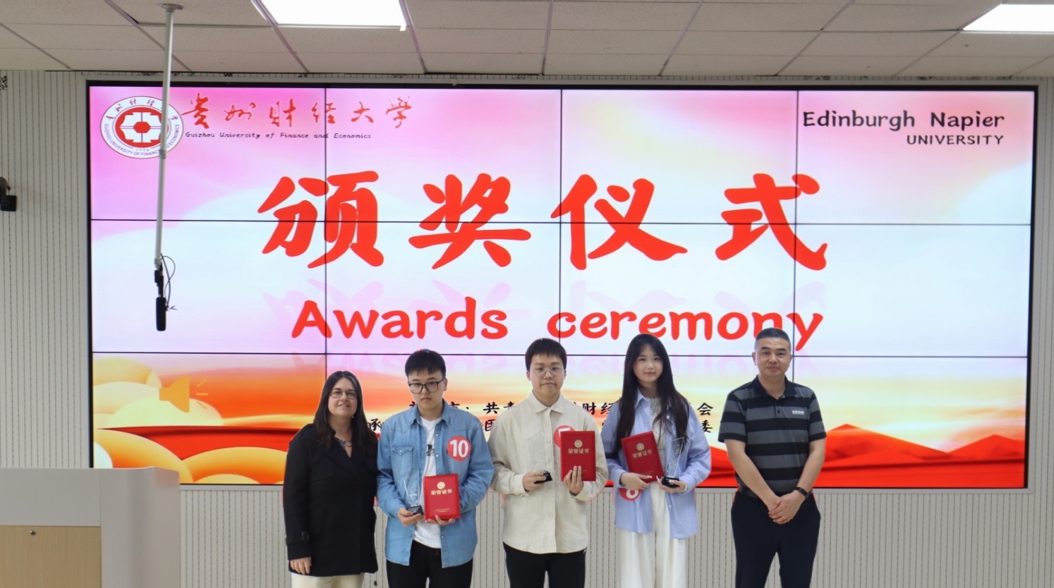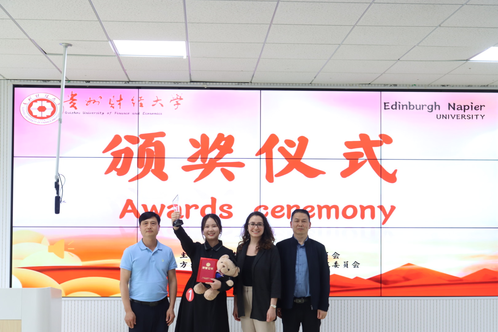 杜剑致辞,他代表公司向远道而来的英国龙比亚大学教师表示热烈的欢迎,向进入决赛的同学们表示衷心的祝贺,同时对同学们提出三点希望:一是夯实英语根基,提升跨文化交流沟通能力。希望同学们充分认识外语学习的重要性,掌握好外语这一跨文化沟通和交流的重要媒介,在全球化的浪潮中努力提高外语水平,加强表达能力,提升综合素质,彰显贵财学子饱满向上的精神风貌;二是以文化铸魂,坚定“四个自信”。希望同学们讲好新时代中国的伟大成就和巨大变革,传播好中国道路和中国方案,阐释好中国理论和中国实践,讲好中国故事,向合作院校师生展示可信、可敬、可爱的中国形象;三是以交流搭桥,促进国际交流合作。希望同学们积极参加国际学术与文化活动月相关活动,了解学术热点,感悟多元文化,开拓国际视野,赋能个人成长。