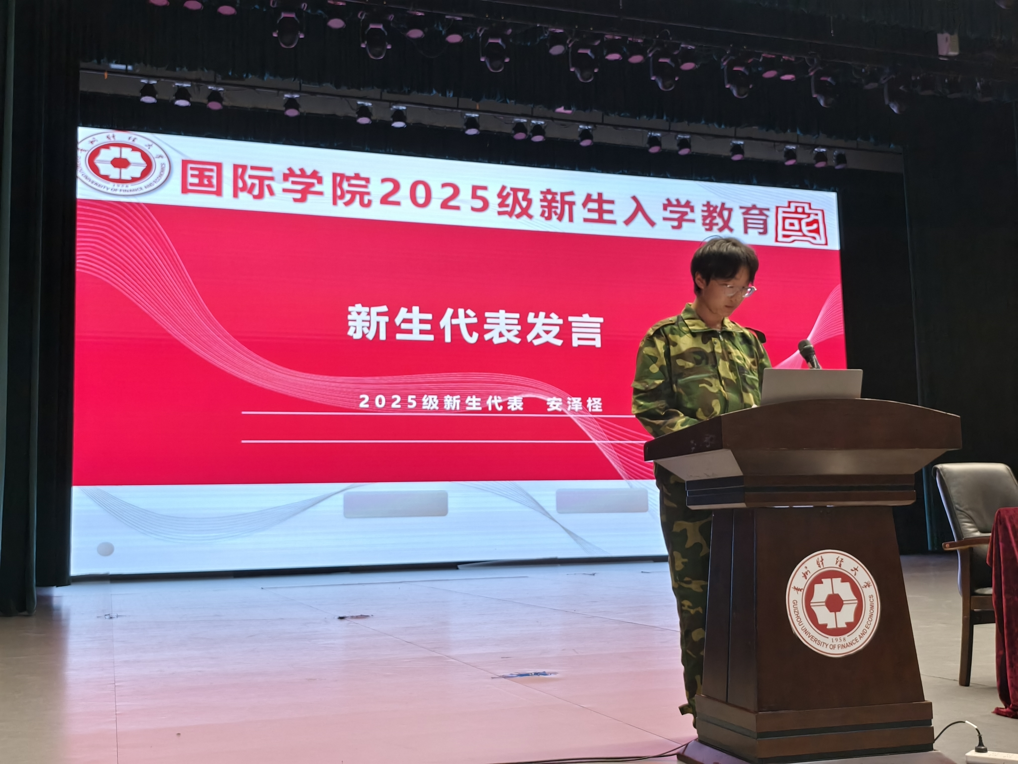 2025级新生代表安泽柽发言,他表示“将会在大学四年中将个人理想融入时代洪流,涓滴之力必能聚成发展巨浪,成为一名做敢闯敢试的探索者,做心怀家国的担当者!”