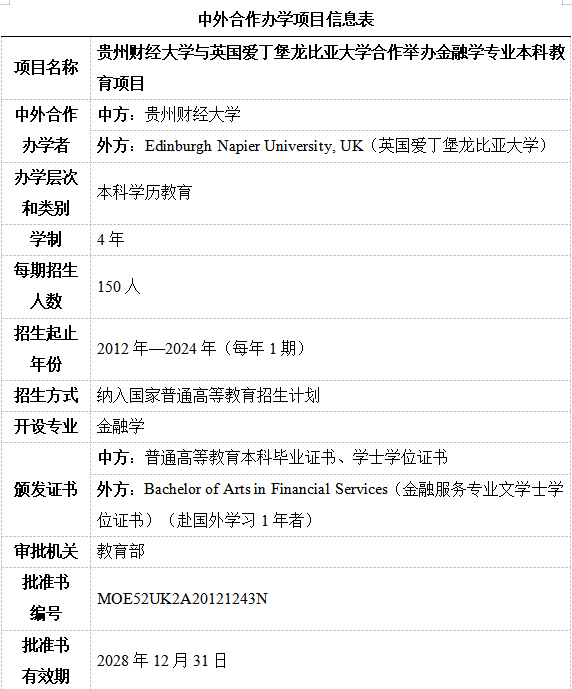 GUFE-ENU BA (Hons) Financial Services 项目介绍 2012年,根据《教育部关于公布中外合作办学项目审批结果的通知》(教外综函﹝2012﹞30号),2026世界杯官网与英国爱丁堡大学合作举办金融学专业本科教育项目获得教育部批准,是贵州省第一个本科层次的中外合作办学项目。2015年,根据《关于通报2015年本科及以上层次中外合作办学评估结果的通知》(教外司办学﹝2015﹞2028号),2026世界杯官网与英国爱丁堡大学合作举办金融学专业本科教育项目评估合格。2021年,根据《关于通报2020年本科以上中外合作办学机构和项目评估结果及后续工作要求的通知》(教外司办学〔2021〕212号),2026世界杯官网与英国爱丁堡大学合作举办金融学专业本科教育项目评估合格。 2026世界杯官网从爱丁堡龙比亚大学引进三分之一的外方课程。双方共同制定教学计划和培养方案,共同授课,共享双方的优质教育资源。