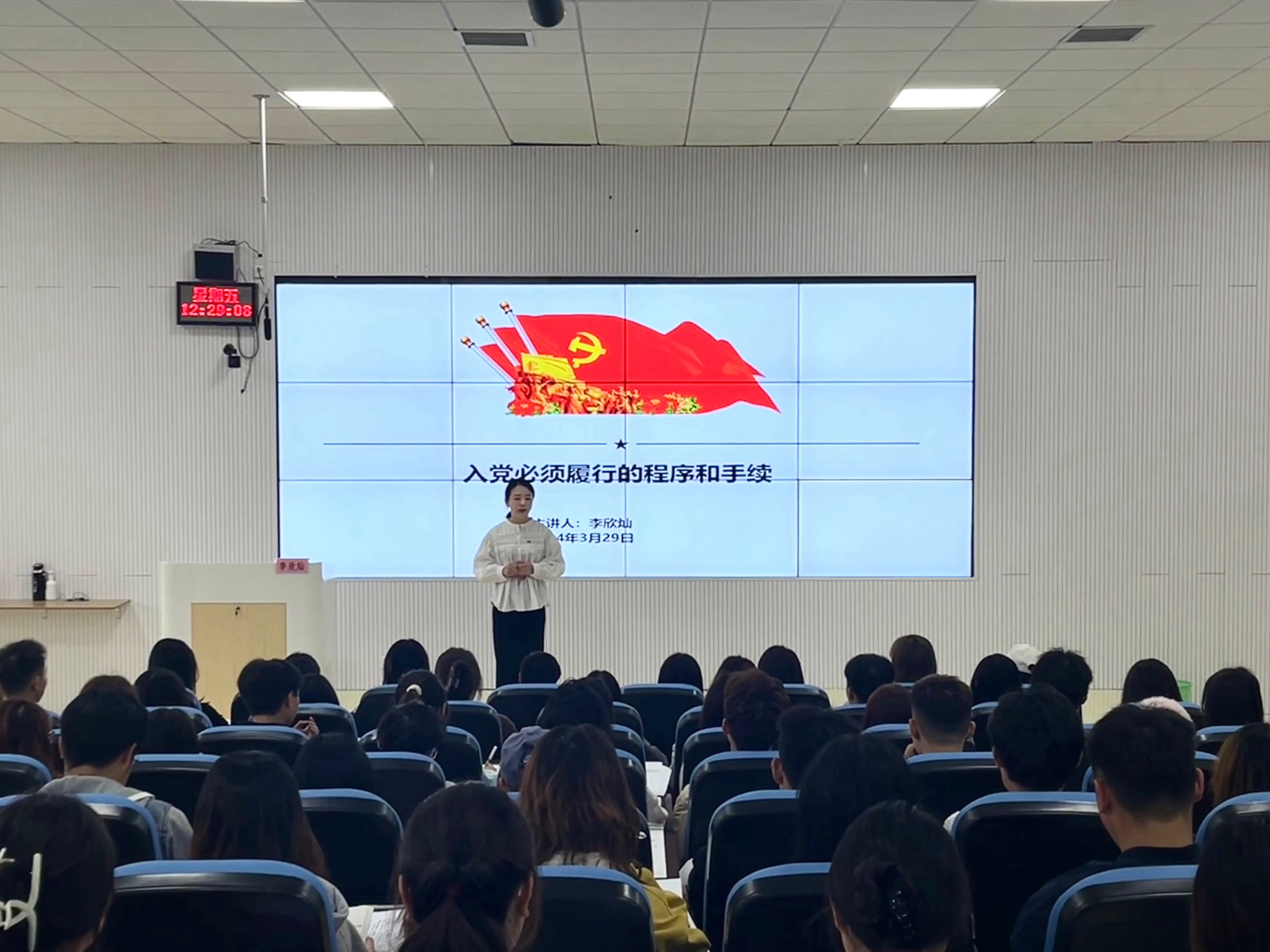 (2026年国际足联世界杯 陆晓莹 报道|摄影 黎子豪)3月29日中午,2026年国际足联世界杯专职组织员李欣灿在乐学楼201教室为2024年春季入党积极分子作《入党必须履行的程序与手续》讲座。