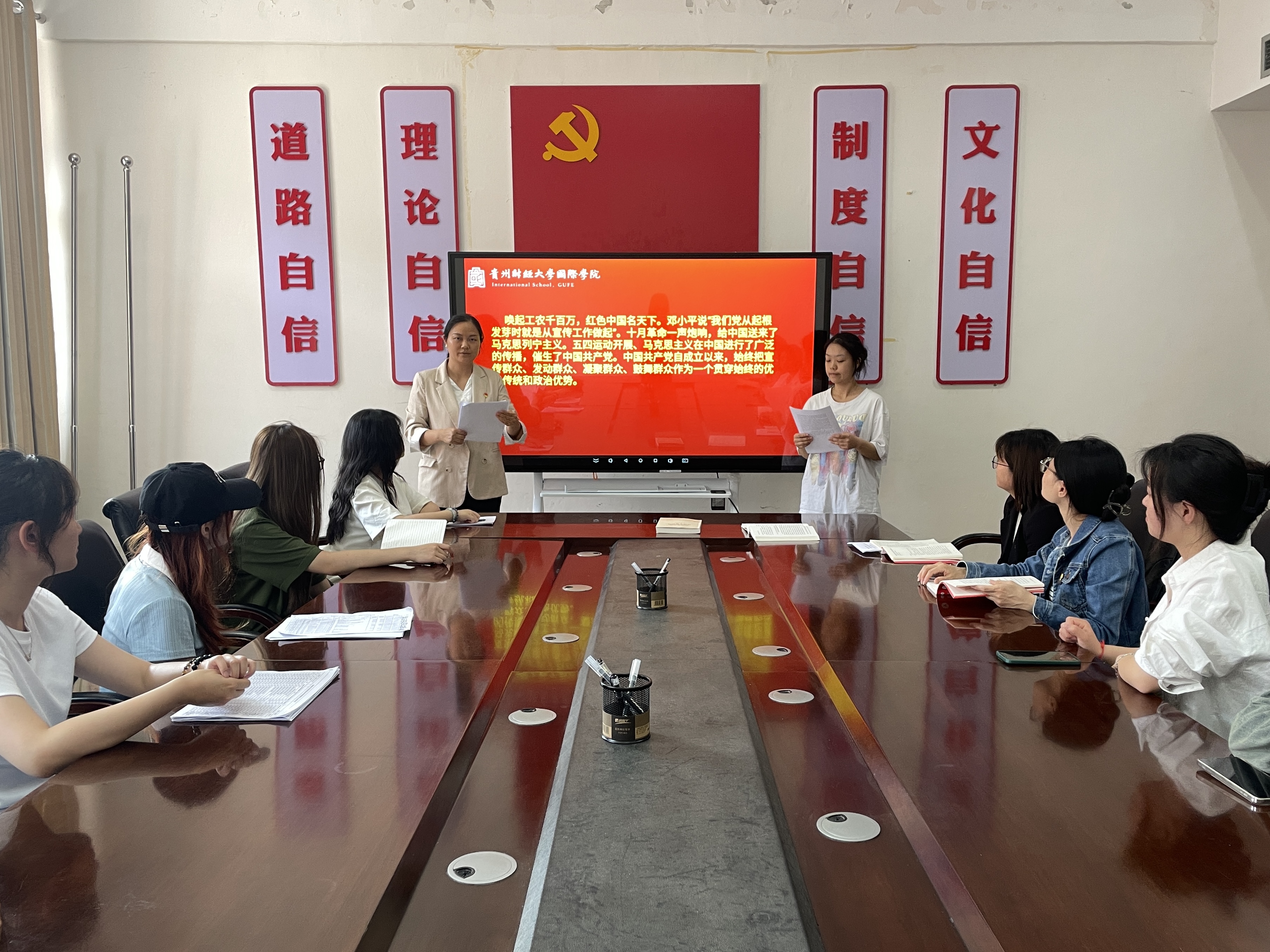 通过宣讲,潘吉还鼓励公司师生,我们作为公司的国际合作交流窗口,务必要树牢“四个意识”、坚定“四个自信”、做到“两个维护”,坚持爱国之心,心怀“国之大者”,努力展现可信、可爱、可敬的中国形象,把贵州故事、贵财故事讲给全世界的朋友们听。