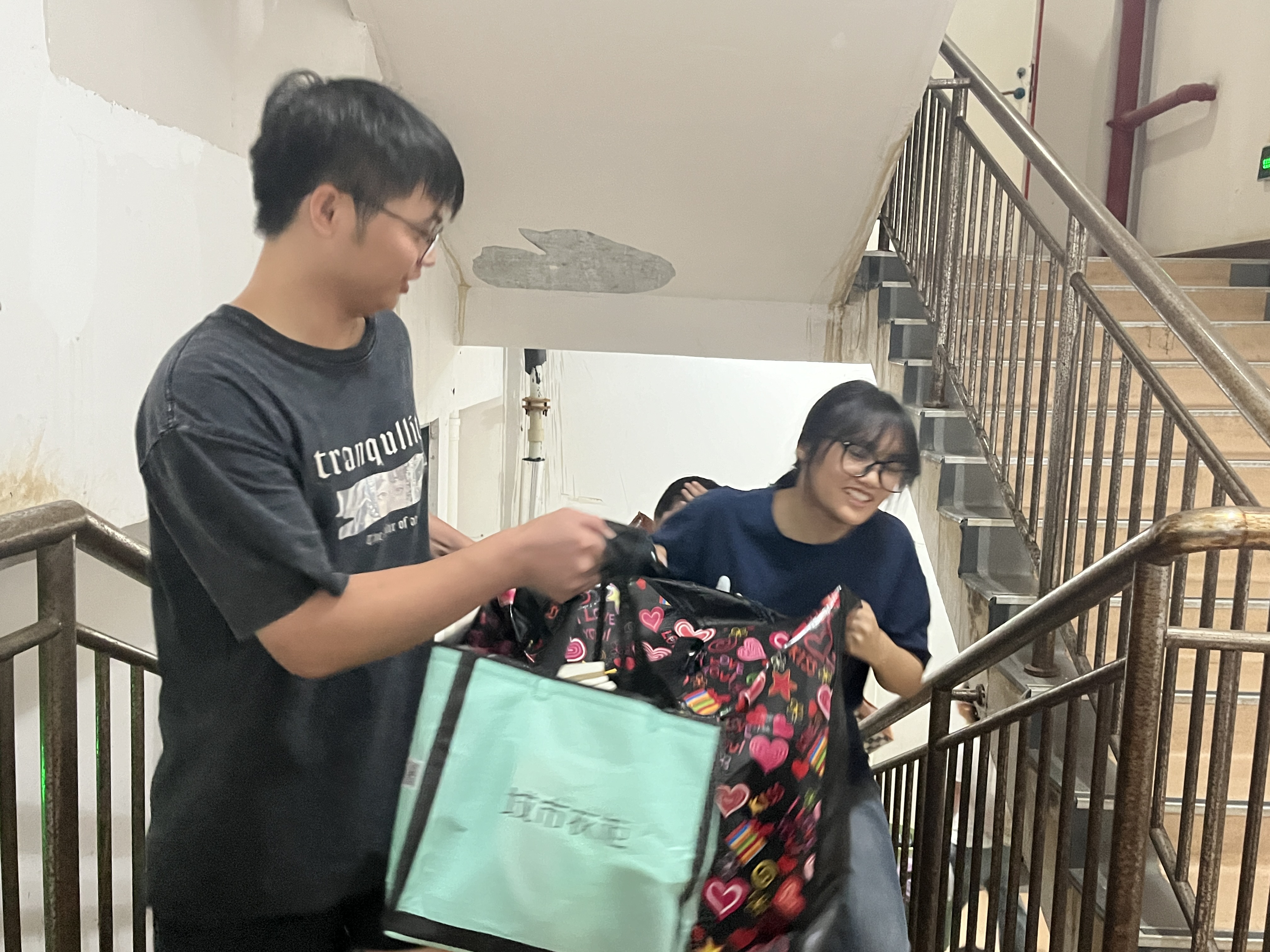 从丹桂苑二号楼到樱花苑四号楼,组织有力、行动高效的志愿者们用自己的热情和力量为同学们的搬迁提供无微不至的帮助,他们不仅协助搬运行李和物品,还时刻关注同学们的情绪和需求,在紧急搬迁任务中开通了一条有温度的“红色通道”,志愿者们奋勇争先、挺膺担当,用实际行动诠释了党员的责任与担当。