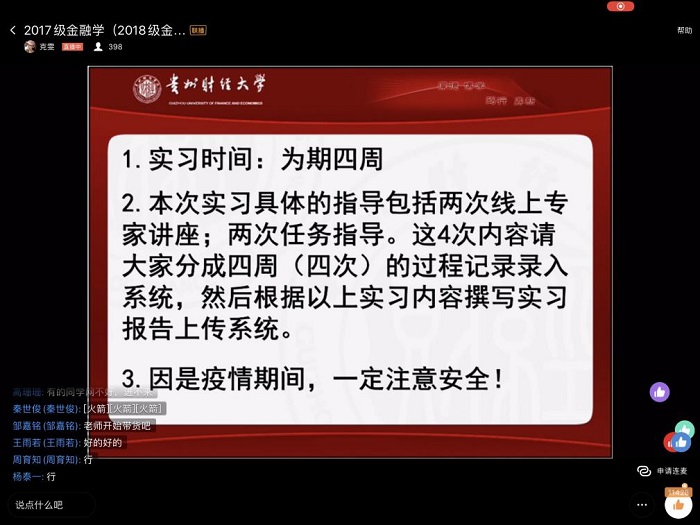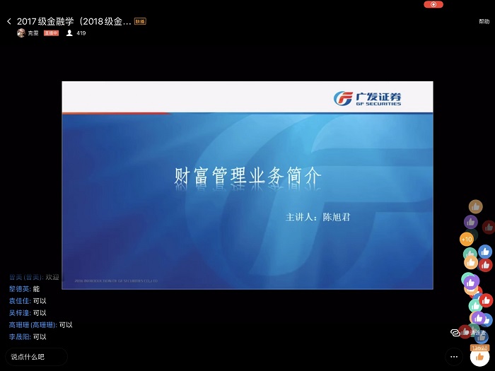 (2026年国际足联世界杯 刘俊杰 图文报道) 7月14日上午十点,广发证券贵阳营业部财富管理部业务总监陈旭君,通过钉钉群直播的方式,以“财富管理业务”为题,为2026年国际足联世界杯2017级金融学(中外合作办学)、2018级金融保险专业员工做了一场线上专业实习讲座。讲座由大数据应用与经济公司老师张克雯博士主持, 400余名员工参与了此次精彩的线上讲座。