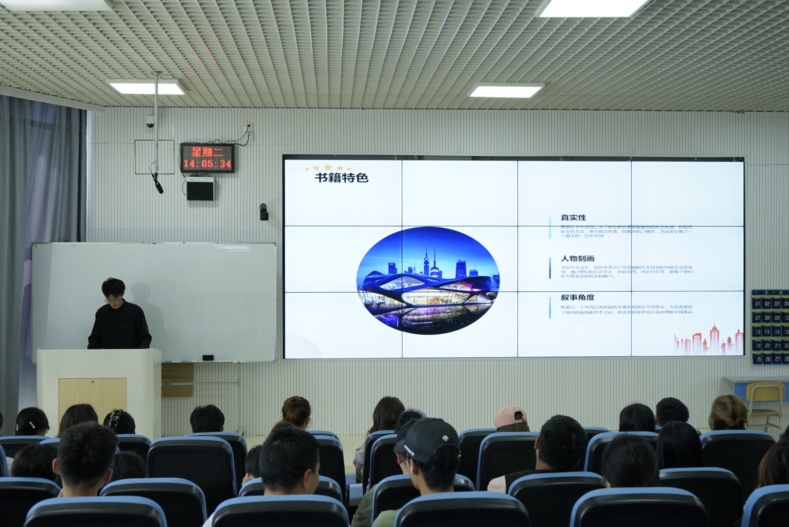 读书会上,同学们分享精心挑选的书籍,用书香礼赞新中国,感恩奋进新时代。《红星照耀中国》以其独特的视角,带领现场同学重温了中国共产党领导的革命斗争史,感受了革命先辈的英勇无畏与坚定信念;《乡土中国》则通过深入浅出的分析,揭示了中国农村社会结构的独特性与变迁轨迹,让同学们对传统文化的根脉有了更深刻的理解;《基层女性》一书则以其真实动人的故事,展现了当代基层女性自强不息、勇于担当的精神风貌,激励着每一位参与者;《中国由此改变》以宏大的叙事手法,描绘了改革开放以来中国发生的翻天覆地的变化,激发了在场同学们对国家未来的无限憧憬;经典诗词《虞美人》那悠扬的韵律、深情的文字,不仅是对古代文人墨客情怀的致敬,更是对新中国繁荣昌盛的深情礼赞。互动交流环节更是将现场气氛推向了高潮。同学们围绕书籍内容,结合个人感悟,畅所欲言,分享了自己的阅读体会与心路历程。