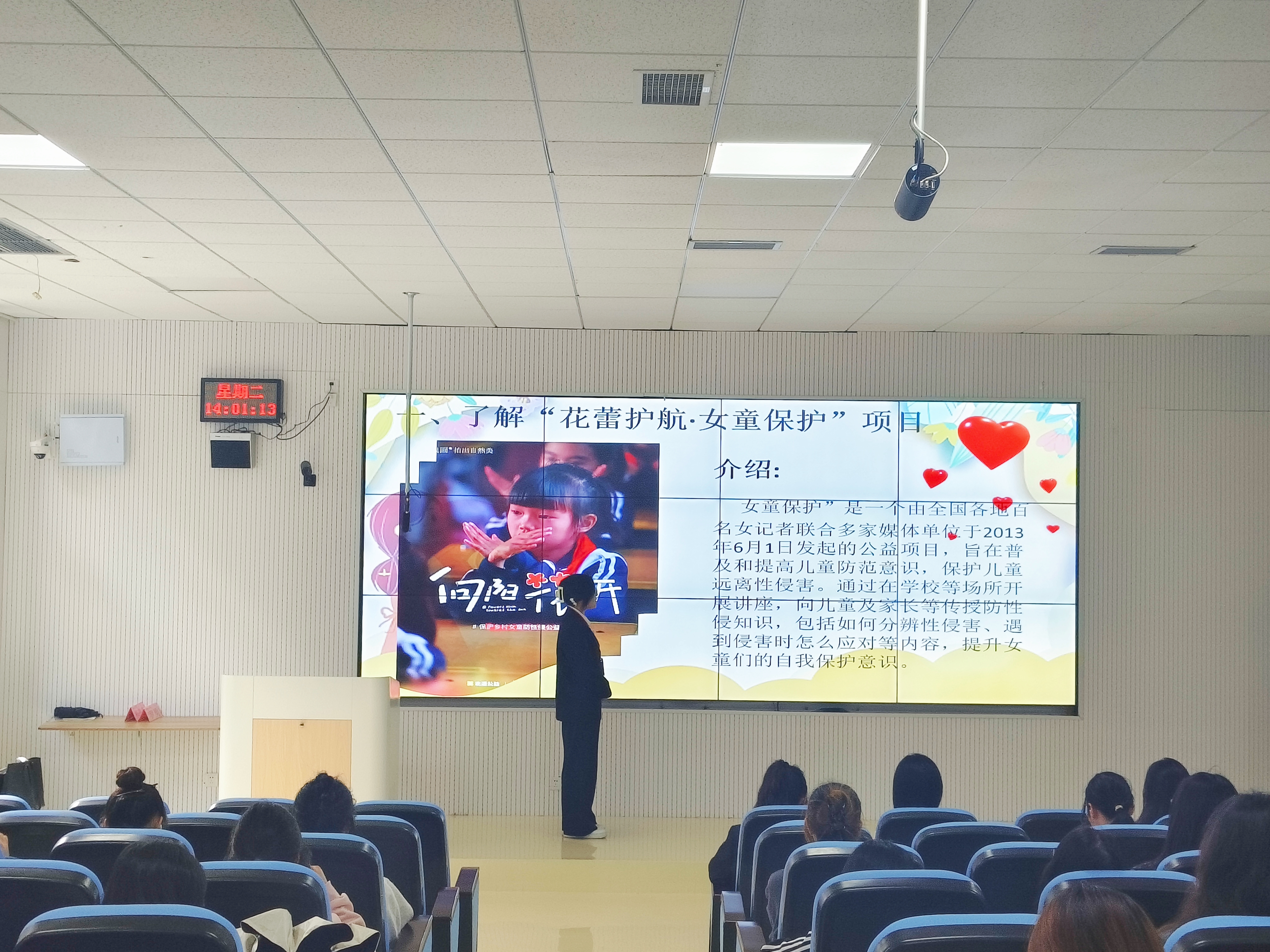 宣讲会开始,主持人匡思齐介绍了“花蕾护航·女童保护”项目的发起背景、重要意义、覆盖范围及长远目标。以陈颖、张方旭为代表的志愿者讲师团队上台分享了她们宝贵的志愿经历。她们深入社区、乡村和公司,通过生动有趣的互动方式,向儿童传授自我保护知识和防范性侵害的法律知识。这些志愿者们用爱心和耐心,为儿童们筑起了一道坚实的心理防线,让他们在成长的道路上更加自信、坚强。现场还播放了优秀讲师对未成年知识教育的视频,视频中,讲师们以生动的案例、亲和的表达方式,将女童保护知识深入浅出地讲解给每一位同学,让现场同学受益匪浅,激发了她们参与女童保护事业的热情和决心。