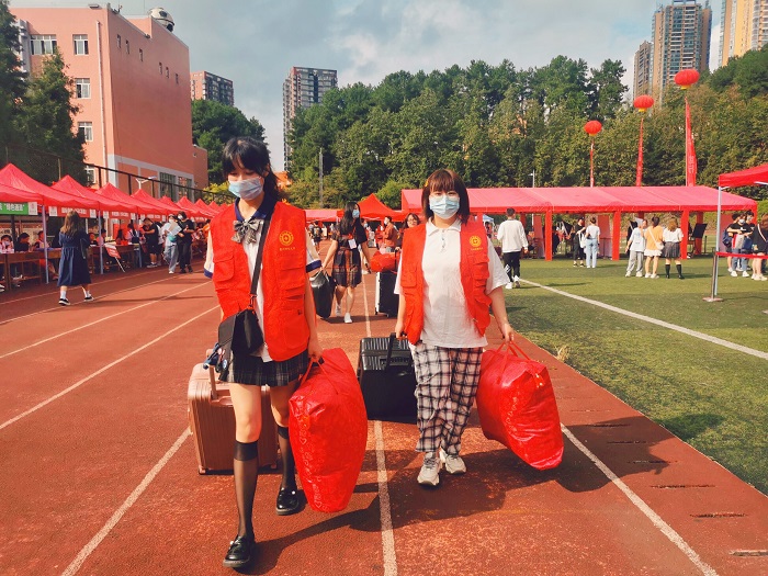 迎新现场,各部门老师和员工志愿者各司其职,全力为迎新保驾护航。根据公司疫情防控的要求,2021级新生经过体温检测、查验健康码行程码和录取通知书、行李消毒等程序后有序进入校园。志愿者热情地带领各位新生前往报道地点,讲解入学注意事项,介绍公司环境。
