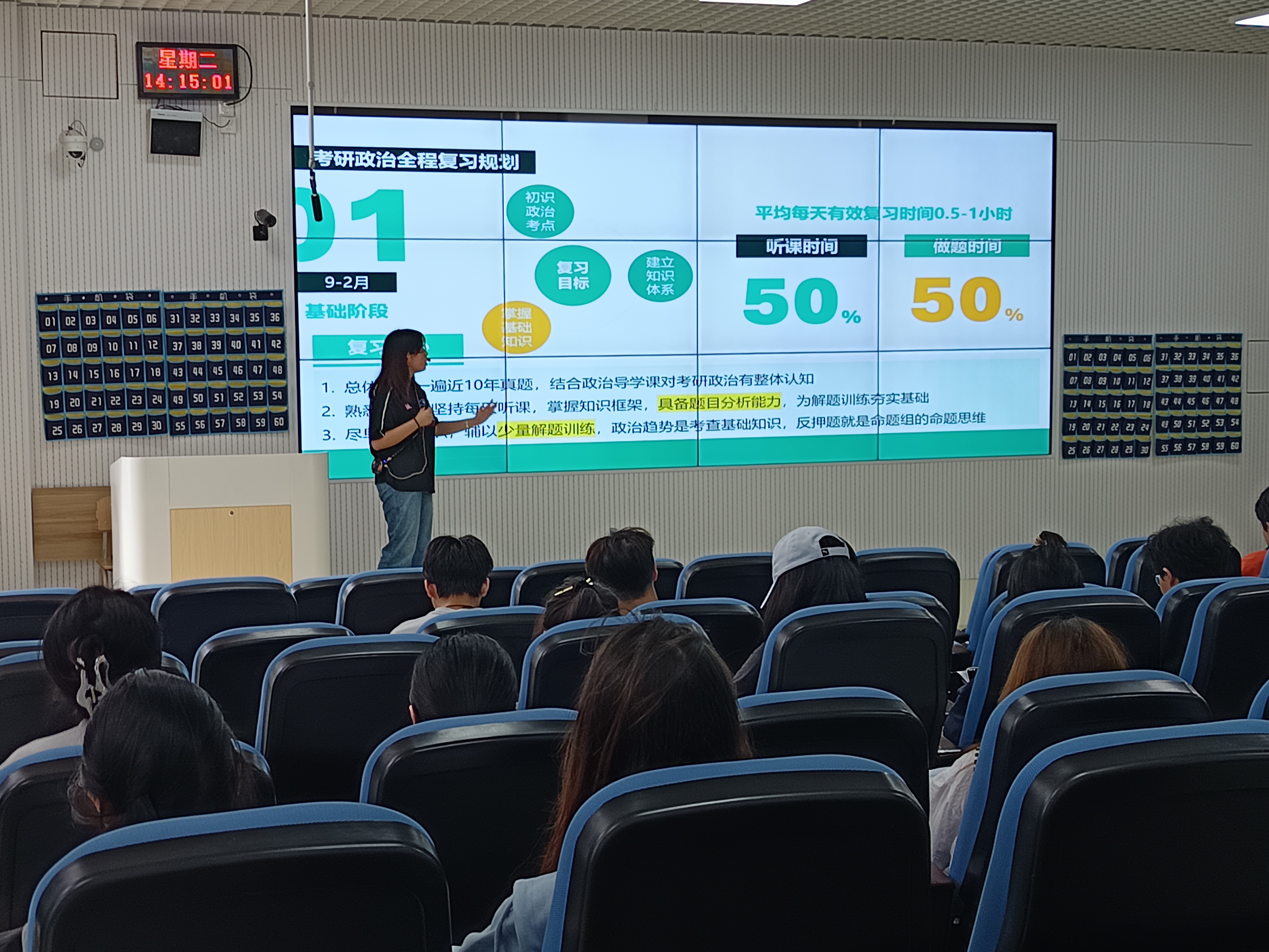 王紫嫣首先聚焦考研公共课整体复习体系,从英语等核心公共课科目入手,细致分析各科目在基础阶段、强化阶段、冲刺阶段的核心目标与复习重点,帮助同学们搭建起清晰、完整的复习架构,为后续分阶段备考明确方向。针对考研英语这一重点科目,王紫嫣深度剖析英语题型特点与命题规律。她着重强调,词汇积累是英语复习的核心基础,只有筑牢词汇根基,才能为后续阅读、写作等模块的复习打下坚实基础。同时,她还指出,同学们需强化阅读逻辑分析力,提升写作表达的规范性,并通过具体题目实例,生动讲解了如何识别题目陷阱、优化答题步骤,切实帮助同学们提升解题的准确性与速度。在互动交流环节,大家积极主动地提出复习中遇到的困惑,围绕公共课复习细节展开深入探讨,王紫嫣耐心细致地逐一解答,学习氛围热烈而浓厚。